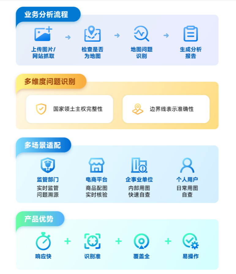 智能审图MapReview 1.0是面向互联网地图监管与行业地图识别的智能体产品,提供地图数据智能抓取识别、问题识别定位、报告自动生成服务,覆盖监管部门、电商平台、企事业单位及个人,满足安全监管与用图需求,可实现地图全方位智能监管、早发现早防范,有效维护国家地理信息安全,强化公众国家版图意识。