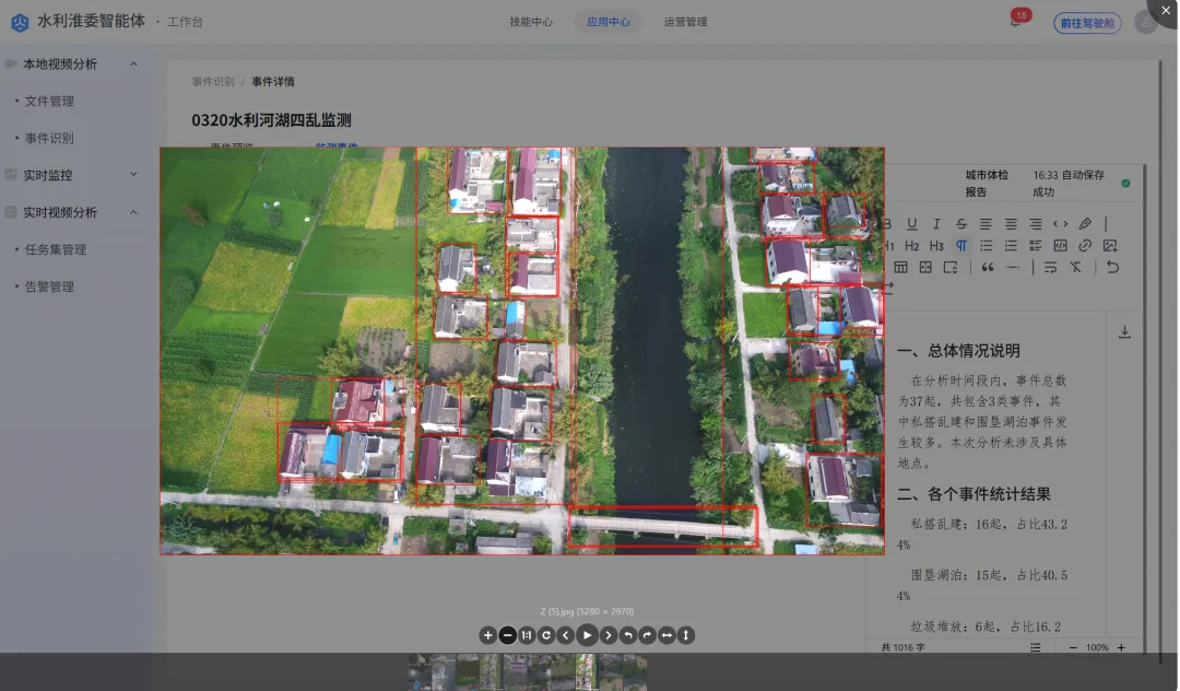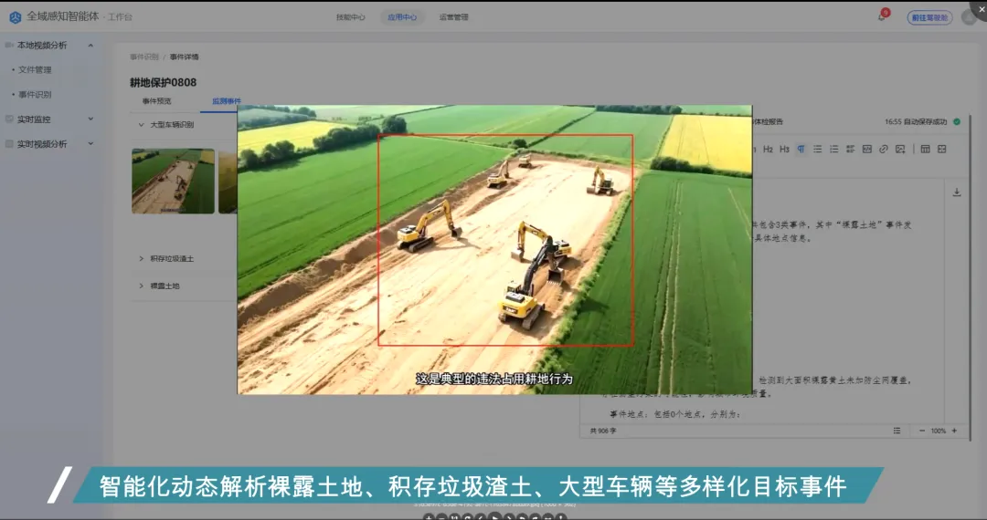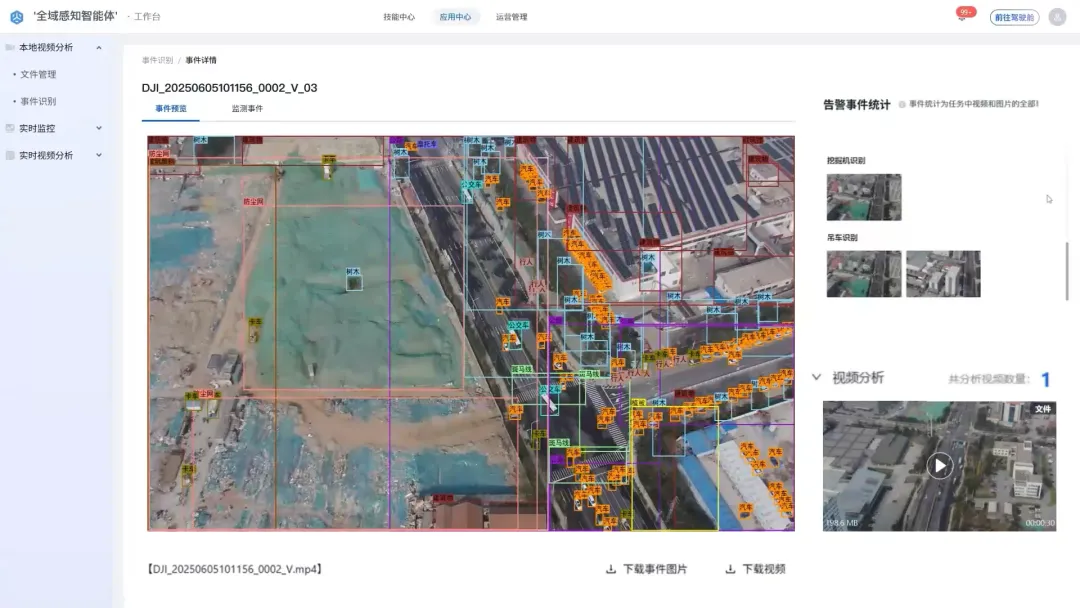 - 精准识别能力:兼容无人机、固定摄像头等多类设备,支持 100 + 目标数据与事件的一次性语义化精准识别,识别准确率达 98%,具备强场景泛化性,综合监测效率提升 30% 以上;