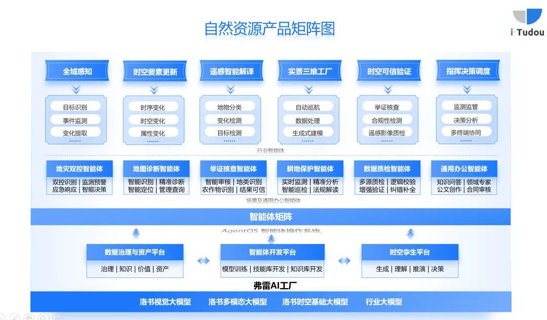 土豆数据自然资源行业智能化解决方案的核心驱动力,源于完全自主研发的 “洛书” 时空基础大模型与 “弗雷 AI 工厂” 全栈 AI 技术底座,构建起自然资源数智化转型的技术基石。