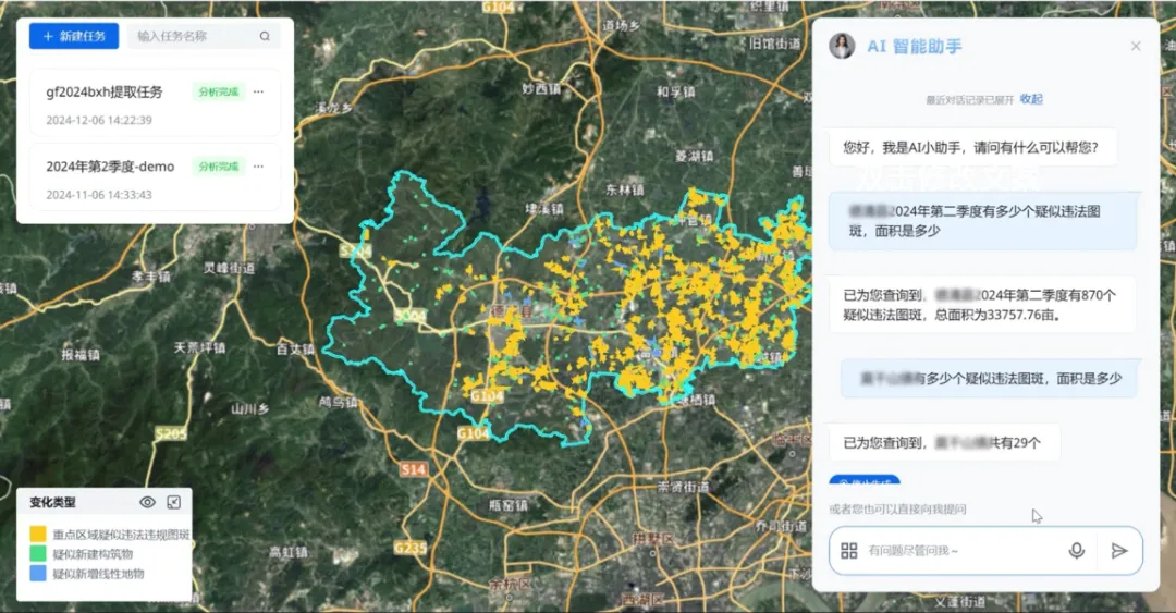 针对卫片图斑数据时效性低、人力紧张等痛点,深度集成 “空天地” 多源数据,构建智能化耕保智能体。用户输入 “近一月用地类型变化分析” 等指令,系统即可快速调取数据,自动生成可视化分析报告,实现跨部门数据无缝共享与智能交互。