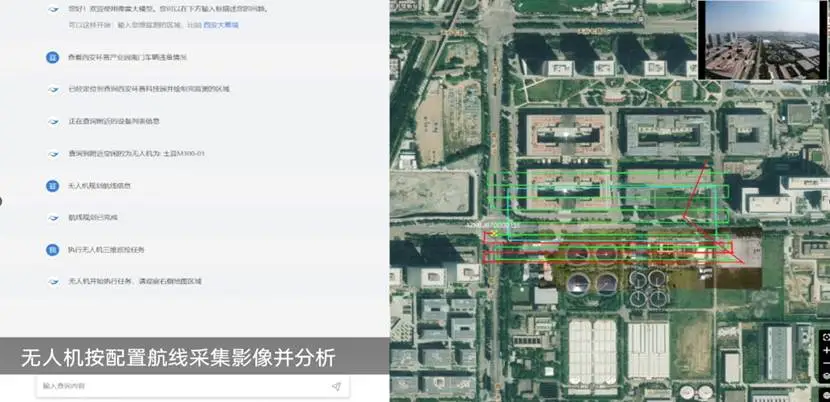 在低空领域,用户仅需通过自然语言下达指令,智能无人机系统可自动解析语义、规划最优航线,驱动无人机自主完成巡航,并实时回传分析结果。该系统能精准理解复杂指令,同步实时解析航拍影像、识别区域变化、检测推送关键事件,大幅提升巡检效率与智能化管理水平。
